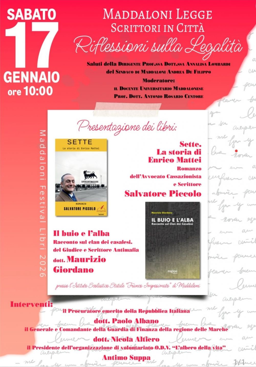 MADDALONI (C.M.) Si è conclusa con un grande successo di pubblico la manifestazione “Maddaloni legge – Scrittori in città”, un’iniziativa dedicata alle riflessioni sulla legalità promossa dall’I.C.S. “Franco Imposimato” sotto l'egida della dirigente scolastica prof. Annalisa Lombardi.