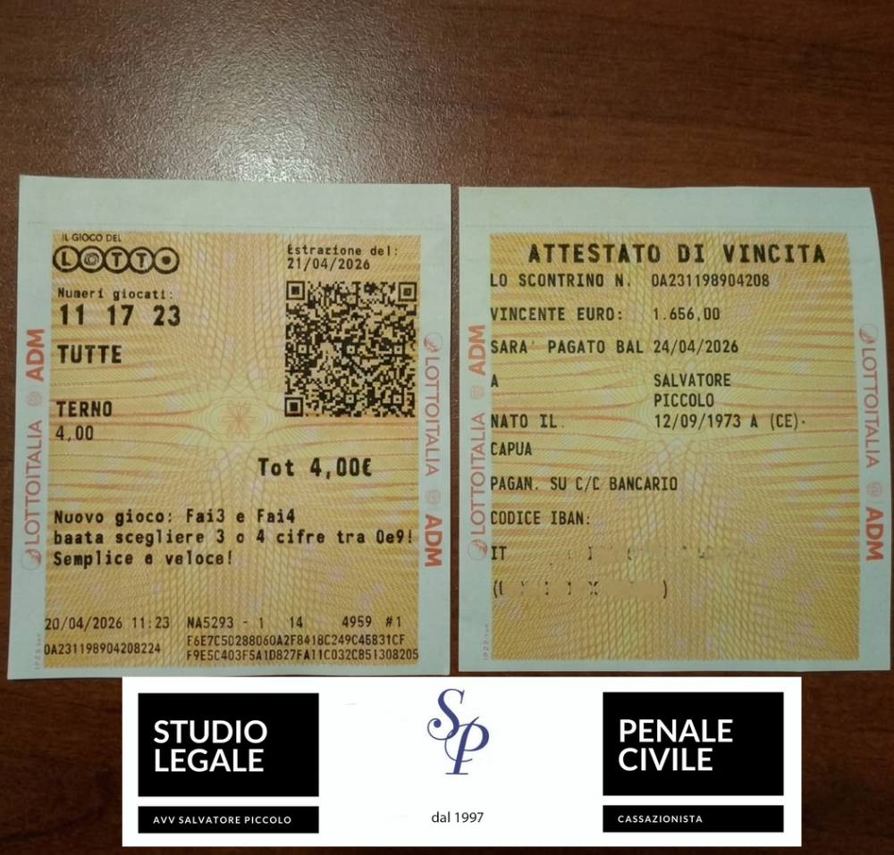 In trent’anni di attività professionale non era capitato mai, allo studio legale da me fondato, di vincere un terno al lotto. Non è un modo di dire, ma un fatto realmente accaduto e strettamente connesso all’attività dello studio. Questa storia merita di essere raccontata dall'inizio.
